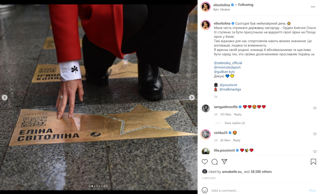 En début de semaine, Elina Svitolina a reçu son étoile sur le Square of Stars ukrainien, leur version de l’Allée des célébrités canadiennes.
