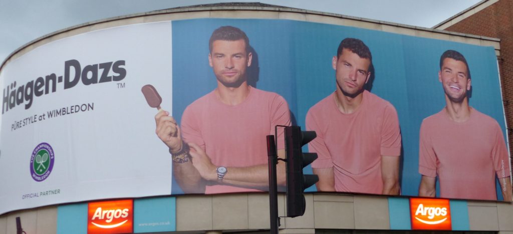 This billboard featuring Grigor Dimitrov was located at the first intersection heading toward Wimbledon Hill Road from the Wimbledon subway station. Struggling lately with a shoulder issue, the 28-year-old Bulgarian wasn’t around too long at the 2019 Championships – beaten 2-6, 3-6, 7-6(4), 6-3, 6-1 in the first round by qualifier Corentin Moutet of France. That may have limited how much Haagen Dazs he was able to enjoy.