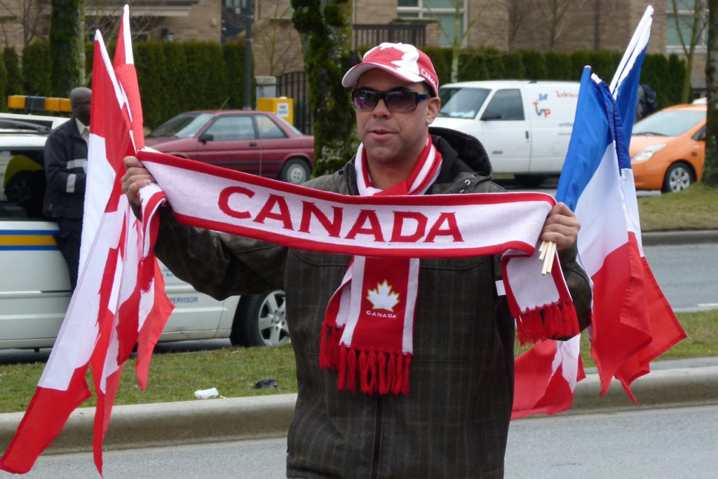 The gentleman pictured here was working both sides of the street – selling Canadian maple leaf and French tricolour flags – during the 2012 Davis Cup tie in Vancouver between the two countries.
