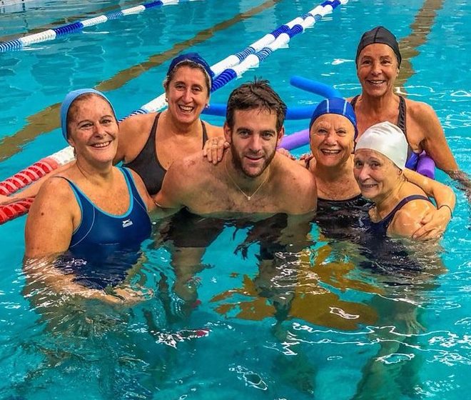 Juan Martin del Potro injured his right knee playing Denis Shapovalov in the first round of the Queen’s Club tournament before Wimbledon. He had surgery for a fractured kneecap on June 20, a procedure that also involved removing a bone fragment. He will be out of action for the rest of 2019. Here the 30-year-old Argentine is doing a little pool rehab surrounded by some female admirers.