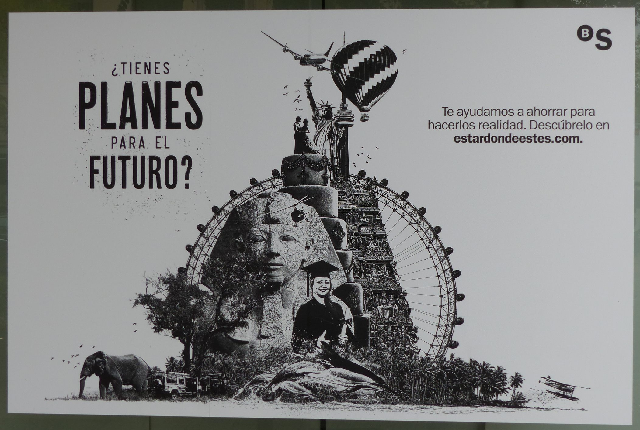 This poster is outside a Banco Sabadell branch in central Madrid. It reads “Do you have plans for the future?” A close look at it reveals an Egyptian pharaoh, the Statue of Liberty and – in the very back – the CN Tower in Toronto. Who’d have thunk it?