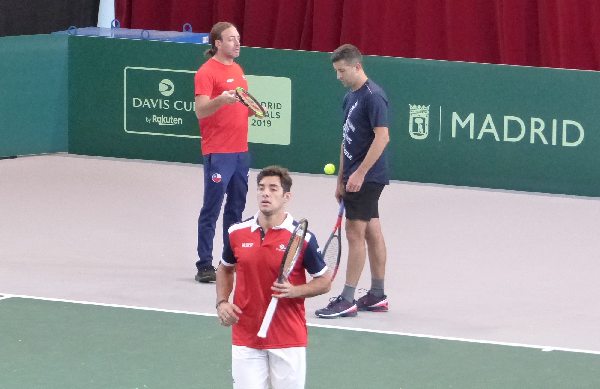Also getting prepped for next week were the Chileans on Pista 1. In the picture here are captain Nicolas Massu talking to doubles player Hans Podlipnik while Christian Garin moves toward the net during a doubles training session. The coach of World No. 5 Dominic Thiem, Massu (gold medalist in singles and doubles at the 2004 Athens Olympics) would normally be at the ATP Finals in London with the Austrian but he had a prior commitment to lead the Chilean Davis Cup team. He left London on Wednesday.