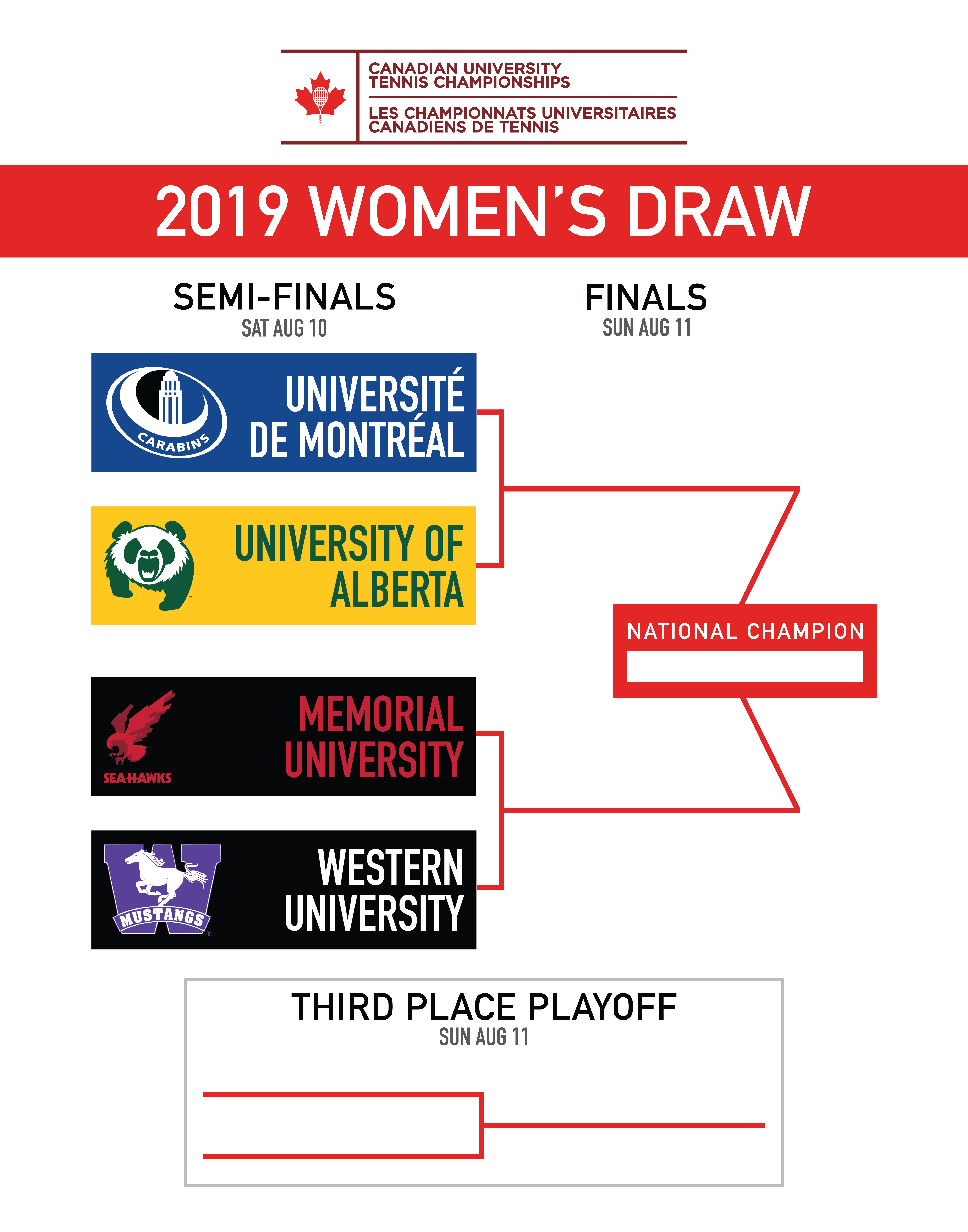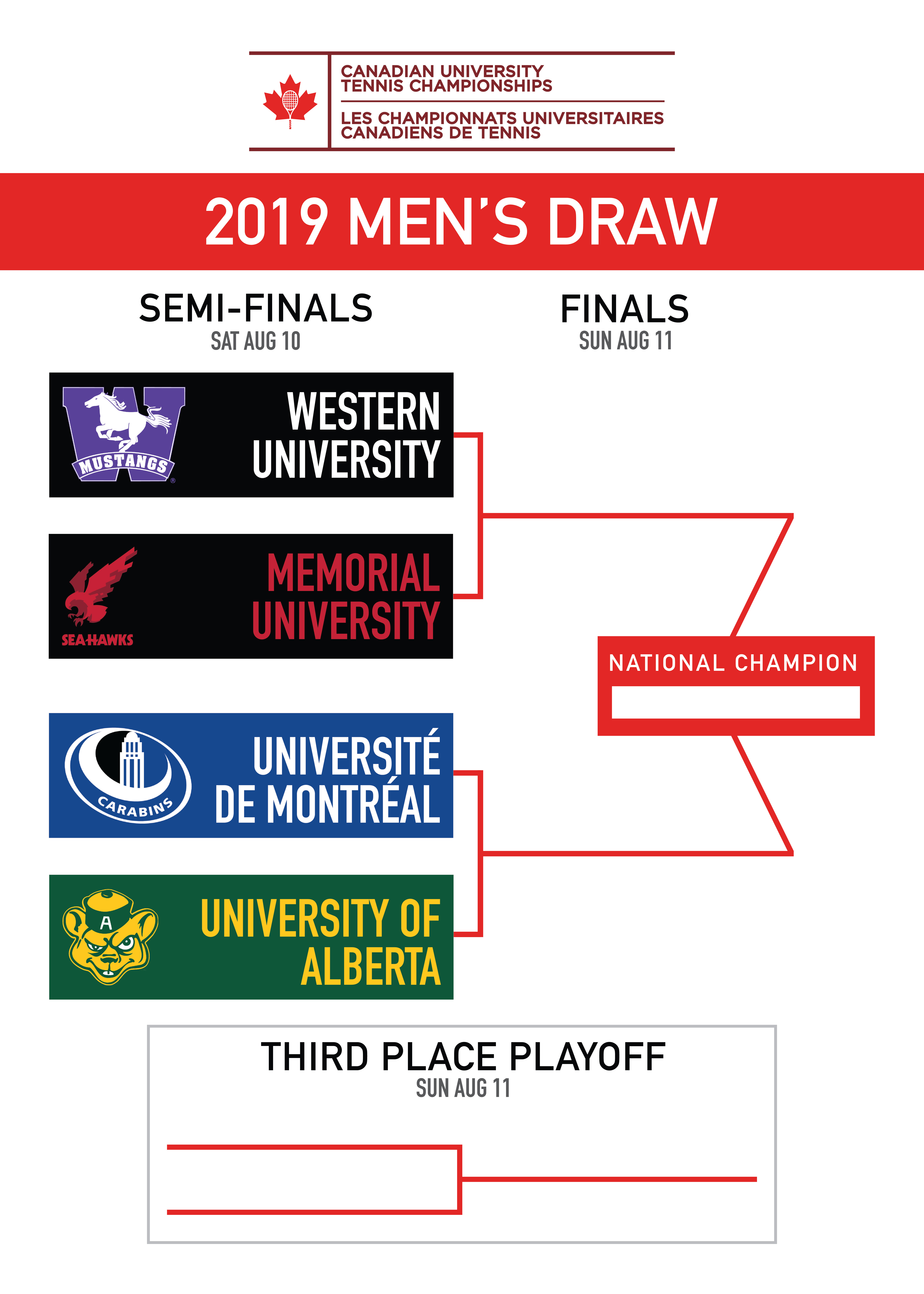 The live draw took place during the coaches’ meeting on July 18. As luck would have it, the men’s and women’s teams face the same opponents in the semi-final matches on August 10. The Western Mustangs and Memorial Seahawks will battle it out in one semi-final, with defending champions Université de Montréal Carabins facing the University of Alberta Golden Bears (men’s team) and Pandas (women’s team) in the other semi-final.